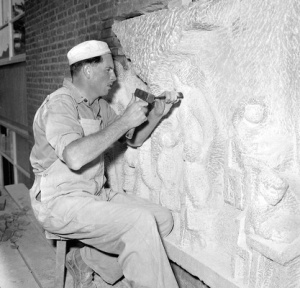 Peter de Jong hakt relief voor de Casembrootschool aan de Zuidsingel in Middelburg. Foto: PZC, 1959. Bron: ZB, Beeldbank Zeeland, rec.nr. 121789. | |