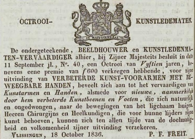 Freit verkreeg in september 1836 voor vijftien jaar octrooi op de uitvinding van verbeterde kunst-armen met beweegbare handen. Hij had eerst kunstarmen gemaakt voor kanonnier J. van der Bol, die het jaar tevoren zijn onderarmen en een oog was kwijtgeraakt bij het springen van een granaat. In het najaar van 1836 werkte hij aan een vergelijkbare set armen voor de gepensioneerde kanonnier A. Sturm uit Middelburg wiens armen eveneens waren afgezet. De kunstarmen waren ‘van hout en hol, en voorzien van snaren, welke er de beweging aan geven. Zij zijn betrekkelijk niet zwaar en zijn met veters aaneengeregen tot een soort lijfje, dat op de schouders gemakkelijk rust en met een breeden band om de borst gesloten is.’ De drager kon de armen bewegen doordat ze aan zijn bovenarmen waren bevestigd. Bewoog hij die van het lichaam af, dan lieten door de kunstarm lopende snaren zijn vingers opengaan. Bewoog hij ze terug, dan sloten de vingers zich en bewoog hij de stomp naar voren, dan kwam de onderarm in de richting van zijn hoofd.