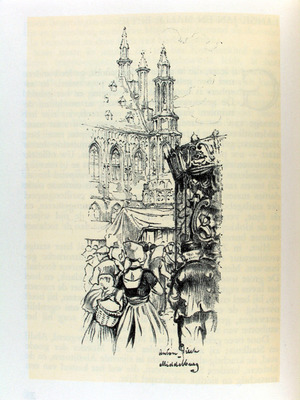 ![]() Boerin met op de achtergrond stadhuis uit Sentimentele Aardrijkskunde Zeeuwse mijmeringen van dr. P.H. Ritter jr. Vervaardiger: Anton Pieck (1952), Collectie Tekeningen en prenten ZB. Bron: ZB, Beeldbank Zeeland, nr. 1668 | |