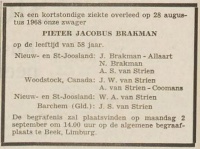 P.J. Brakman had al in zijn jeugd grote belangstelling voor de natuur, aanvankelijk vooral planten en schelpen, later ook vogels. Door het bestuderen van paddestoelen kwam hij veelvuldig in aanraking met de daarin levende kevers. Al spoedig concentreerde hij al zijn aandacht op deze insecten en ontwikkelde zich tot één van de grootste keverkenners, die Nederland gehad heeft. Vooral de faunistiek had zijn belangstelling. Publicaties van hem verschenen in de ‘Entomologische Berichten’. Verder bewerkte hij een Duits keverboek in het Nederlands `Welke kever is dat?'. In 1968 verscheen zijn `Lijst van Coleoptera uit Nederland en het omliggende gebied'. Zijn collectie kevers en wantsen bevindt zich thans in het Rijksmuseum van Natuurlijke Historie te Leiden. De twee laatste jaren van zijn leven woonde hij in Limburg en werkte als conservator aan het Natuurhistorisch Museum te Maastricht. Na een kortstondige ziekte overleed Brakman vrij plotseling op 28 augustus 1968 te Elsloo.
