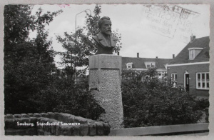 Borstbeeld van Pieter Louwerse in Oost-Souburg, ontworpen door Pieter Puijpe. Prentbriefkaart, ca. 1970. Vervaardiger: Bazar Kemeling. Bron: ZB. Beeldbank Zeeland, nr. 17126.