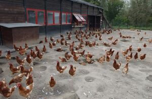 Ter Mee; biologische boerderij, kippen. Foto: J. Wolterbeek, 2002. Bron: ZB/Beeldbank Zeeland, rec.nr. 103382