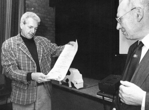 PZC-journalist R. Antonisse (links) ontvangt de Vijverberg-Lysenprijs van F. Jansen, de voorzitter van de Natuur- en Vogelwacht Schouwen-Duiveland in een zaal van de gereformeerde kerk. Foto: P. Honhoff, 17-3-1989. Bron: ZB, Beeldbank Zeeland, rec.nr. 160832 | |