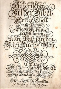 Samuel de Swaef onderscheidde zich onder andere door zijn kaffigrafische werken. Tekening: Titel van het eerste deel van een bijbel, gegraveerd door Johann Ulrich Krauß (Augsburg, Duitsland, 1700). Bron: Wikimedia Commons. | |