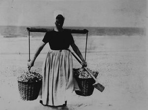 Vrouw Klopmeyer met emmer schelpen en schelphouweel, ca. 1935. Bron: ZB/Beeldbank Zeeland, rec.nr. 19085
