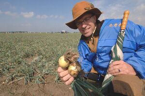 Boer controleert uien op de Nationale Uiendag. Foto: J. Wolterbeek, 2006. Bron: ZB/Beeldbank Zeeland, rec.nr. 113805