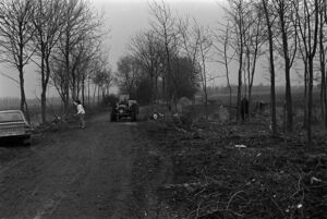 Snoeien van bomen aan de Breeweg in Middelburg. Het werk wordt uitgevoerd door de Werkplaatsen Walcheren en drie aannemers, in opdracht van het Wegschap Walcheren. Foto: PZC, 14-12-1983. Bron: ZB/Beeldbank Zeeland, rec.nr. 382