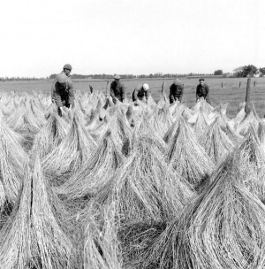 Het uitkeren van geroot vlas op de droogweide bij Aardenburg. Arbeiders in het vlas werkten vaak op tarief, ca. 1965, foto: O. de Milliano, Zeeuwse Bibliotheek, Beeldbank Zeeland, recordnr. 85305