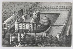 Kasteel Zandenburg anno 1559 oorspr. gravure van J.Koole. [1839] naar een schilderij in het stadhuis van Veere. Prentbriefkaart J. Perrels. Bron: ZB/Beeldbank Zeeland, rec.nr. 28410