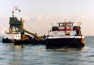 Zandwinning door een kleine zandzuiger op de Westerschelde. Foto: J. Wolterbeek, 1998. Bron: ZB/Beeldbank Zeeland, rec.nr. 129815