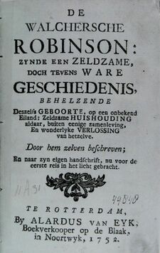 [[Bestand:Walcherse Robinson1.jpg|thumb|right|225px|Titelpagina van ''de Walchersche Robinson'' gedrukt in Rotterdam in 1752. Foto: W. Helm, 1996. Bron: ZB/Beeldbank Zeeland, rec.nr. 3074]] | |||