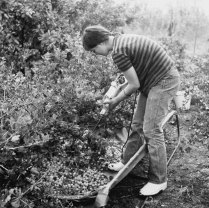 Het machinaal oogsten van kruisbessen te Ovezande, nodig voor de bereiding van eiers en beiers, 1968, foto, Zeeuwse Bibliotheek, Beeldbank Zeeland, recordnr. 58921