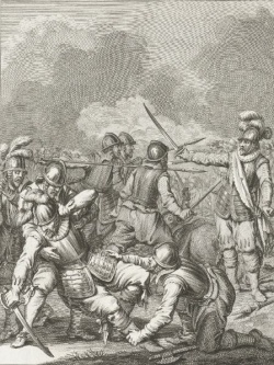 De dood van Karel van Boisot bij Duiveland in 1575, prent door Theodoor Koning naar een tekening van Jacobus Buys, ca. 1785, bron: Rijksmuseum.nl | |