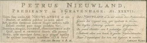 [[Bestand:Brahe_KZGW_ZI_IV_1094.jpg|thumb|center|500px|Achtregelig gedicht in Latijn door J.J. Brahe op het leven van de predikant Petrus Nieuwland, detail uit kopergravure, KZGW, ZI IV, 699.]] | |||