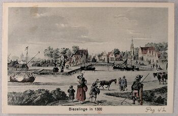 Biezelinge in 1300. Gezicht op de haven en de Markt. Rechts de kerk van Biezelinge (In 1511 gesticht toen de daar aanwezige kapel verheven werd tot parochiekerk en de Biezelingenaren een eigen pastoor kregen. In 1907 werd dit kerkgebouw tot de grond toe afgebroken en op dezelfde plaats werd een geheel nieuw gebouw opgetrokken). Links is de kerk van Eversdijk te zien.De (originele) gravure is gemaakt naar een tekening in pen en penseel in bruin en is uit de achttiende eeuw. De tekening stamt uit de tweede helft van de zeventiende eeuw. Prentbriefkaart, Th. de Bart. Bron: ZB, Beeldbank Zeeland, rec.nr. 1094]] | |||