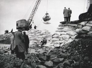 [[Bestand: | [[Bestand:Pluimpotdam1.jpg|thumb|right|300px|De dam van nylonzakken in de Pluympot werd gedicht op 16 oktober 1957, echter in de nacht van 22 op 23 oktober werd bij vliegende storm en met giergetij een gat van ca. 50 m. geslagen. Op 13 november werd de Pluympot definitief afgesloten. Dragline-machinist was Leen de Pinder (Werkendam). Foto: PZC, 13-11-1957. Bron: ZB/Beeldbank Zeeland, rec.nr. 211]] | ||