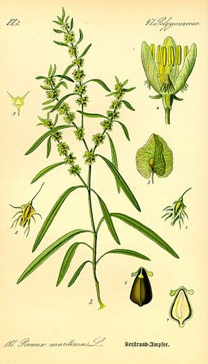 Zuring (rúmex). Plantengeslacht, waarvan in Zeeland ca. 9 soorten min of meer regelmatig voorkomen. Hiervan zijn de ridderzuring. (R. obtusifólius) en de krulzuring (R. críspus) het meest algemeen. Beide soorten komen overal in Zeeland voor op enigszins vochtige en ruderale plaatsen. Een soort die sterk op de eerste lijkt is de kluwenzuring (R. conglomerátus). Deze is echter ietwat tengerder en groeit doorgaans in een wat vochtiger omgeving en komt in geheel Zeeland algemeen voor. Een nauwe verwant is de bloedzuring (R. sanguíneus), maar deze komt uitsluitend voor in oudere loofbossen. Men vindt haar vooral in de binnenduinrand en op landgoederen en buitenplaatsen in het poldergebied, samen met bosplanten als nagelkruid, look zonder look e.d. Het is beslist geen algemene plant. Op drassige voedselrijke plaatsen in graslanden en natte ruderale plaatsen groeien de moeraszuring (R. pálustris) en de zeezuring (R. marítimus). Beide soorten ontbreken in brakke milieus. Zij komen in Zeeland plaatselijk vrij veel voor. In rietlanden en moerassen met zoet of zwak brak water komt de waterzuring (R. hydrolápathum) vrij veel voor. Ook deze soort ontbreekt in de zilte gebieden. In Zeeland komen twee zuringsoorten in graslanden voor: het meest algemeen is de veldzuring (R. acetósa), deze groeit in geheel Zeeland in wegbermen, op dijken en in hooilanden; op schrale zandgrond, m.n. in de duinen, het Zeeuws-Vlaamse grensgebied en op spoorwegen en -emplacementen komt de schapezuring (R. acetosélla) voor. In het polderland ontbreekt deze soort op de meeste plaatsen. | Zuring (rúmex). Plantengeslacht, waarvan in Zeeland ca. 9 soorten min of meer regelmatig voorkomen. Hiervan zijn de ridderzuring. (R. obtusifólius) en de krulzuring (R. críspus) het meest algemeen. Beide soorten komen overal in Zeeland voor op enigszins vochtige en ruderale plaatsen. Een soort die sterk op de eerste lijkt is de kluwenzuring (R. conglomerátus). Deze is echter ietwat tengerder en groeit doorgaans in een wat vochtiger omgeving en komt in geheel Zeeland algemeen voor. Een nauwe verwant is de bloedzuring (R. sanguíneus), maar deze komt uitsluitend voor in oudere loofbossen. Men vindt haar vooral in de binnenduinrand en op landgoederen en buitenplaatsen in het poldergebied, samen met bosplanten als nagelkruid, look zonder look e.d. Het is beslist geen algemene plant. Op drassige voedselrijke plaatsen in graslanden en natte ruderale plaatsen groeien de moeraszuring (R. pálustris) en de zeezuring (R. marítimus). Beide soorten ontbreken in brakke milieus. Zij komen in Zeeland plaatselijk vrij veel voor. In rietlanden en moerassen met zoet of zwak brak water komt de waterzuring (R. hydrolápathum) vrij veel voor. Ook deze soort ontbreekt in de zilte gebieden. In Zeeland komen twee zuringsoorten in graslanden voor: het meest algemeen is de veldzuring (R. acetósa), deze groeit in geheel Zeeland in wegbermen, op dijken en in hooilanden; op schrale zandgrond, m.n. in de duinen, het Zeeuws-Vlaamse grensgebied en op spoorwegen en -emplacementen komt de schapezuring (R. acetosélla) voor. In het polderland ontbreekt deze soort op de meeste plaatsen. | ||