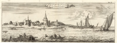 ‘Rommerswaal aan de zeekant, meest geïnundeert of weghgespoelt’. Kopergravure van Zeelands beroemdste verdronken stad Reimerswaal, waar de laatste inwoners in 1631 vertrokken naar Tholen; afbeelding uit de ‘Cronijk’ van Smallegange (1696).
