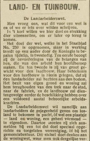 [[Bestand:Mes20nov1918pag1. | [[Bestand:Mes20nov1918pag1.JPG|300px|thumb|right|Artikel over de Landarbeiderswet in de Maas- en Scheldebode van 20 november 1918, bron: http://www.krantenbankzeeland.nl]] | ||