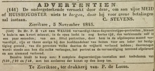 [[Bestand:Weijde_ZN5nov1845.jpg|thumb|center| | [[Bestand:Weijde_ZN5nov1845.jpg|thumb|center|500px|Advertentie van het fotobedrijf van P.H. van der Weijde in de [https://krantenbankzeeland.nl/issue/zni/1845-11-05/edition/0/page/2 Zierikzeesche Nieuwsbode van 5 november 1845]]] | ||