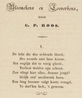 | onderschrift = Gedicht 'Bloemekens en looverkens' van G.P. Roos, in: [https://tijdschriftenbankzeeland.nl/issue/cad/1854-01-01/edition/null/page/74 ''Cadsandria'' (1854) 28.] | | onderschrift = Gedicht 'Bloemekens en looverkens' van G.P. Roos, in: [https://tijdschriftenbankzeeland.nl/issue/cad/1854-01-01/edition/null/page/74 ''Cadsandria'' (1854) 28.] | ||