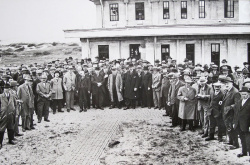 Opening van het pompstation De Blinkert in de duinen van Haamstede; de afgebeelde personen zijn allen notabelen, links vooraan met de handen over elkaar, staat Adriaan van der Weijde, lid van GS en promotor van de waterleiding; de toegangsweg is naar hem genoemd. Herkomst: