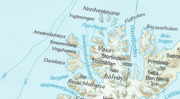 Kaart van het noordwesten van Spitsbergen met Amsterdam eiland en ten oosten daarvan Zeeusche Uitkijck, Polar Institut, Tromsö, 2009.