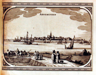 In het onlangs vernieuwde gemeentehuis van Arnemuiden is een niet onbelangrijke schilderijenverzameling betreffende de historie van de plaats, o.a. een stadsgezicht van omstreeks 1550, één van de mooist bewaard gebleven stadsgezichten uit die tijd. De korenmolen `Nooitgedacht' (voor 1928 `De Nijverheid' geheten) uit 1736 was een brede achtkantige bovenkruier zonder stelling en grondzeiler. In 1977 brandde hij geheel uit. In de belt van de molen zijn in 1978 bij sloopwerkzaamheden vier funderingsblokken gevonden van een voorganger, een standermolen. In 1981 werd de afgebrande molen vervangen door een nieuwe. Arnemuiden bezit nog restanten van vestingwerken. De aanleg van deze verdedigingswerken is begonnen in 1567, voortgezet tijdens de Spaanse bezetting door de Italiaanse vestingbouwer Scipio Campi en na de overgang tot Oranje in 1574 verder uitgebreid met steun van Prins Willem I. Volgens de plannen van de ingenieur Abraham Andries kreeg de vesting aan de landzijde twee een hele en een half bolwerk met een hoofdgracht en aan de waterzijde slechts een getenailleerde wal. Er waren vijf poorten, de Middelburgse-, Veerse- en aan de waterzijde de Tol-, Markt- en St.-Jorispoort. De bouw heeft tot omstreeks 1600 geduurd, spoedig daarna trad verval in. In Oud Arnemuiden, destijds zuid-westelijk van het tegenwoordige Arnemuiden gelegen, stond het kasteel Ter Mortiere. Ten westen van Arnemuiden lag tot 1963 nog een duidelijk overblijfsel van een vluchtberg werven); tijdens een ruilverkaveling in het gebied van Kleverskerke-Arnemuiden is de heuvel geëgaliseerd en oudheidkundig onderzocht. In het uitbreidingsplan Brakenburg, ten noorden van Arnemuiden, zijn bij graafwerkzaamheden in 1975 overblijfselen van een nederzetting uit de late IJzertijd gevonden prehistorie). Geschiedenis: Er moet een onderscheid gemaakt worden tussen het oude (verdwenen) Arnemuiden en het nieuwe Arnemuiden. Het vroegste Arnemuiden, reeds in 1223 vermeld, lag aan de zuidzijde van de monding van de Arne, daar waar later de Middelburgse polder is ontstaan.