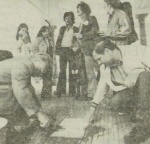 Stenen met de woorden YES en NO, een kunstwerk van Willem Buijs (midden op de achtergrond van de foto) worden aangebracht in de Graanbeurs in Middelburg, bron: Krantenbank Zeeland, PZC, 4 juni 1977, pag. 9