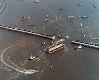 Afsluiting Brouwershavense Gat. Invaren van de laatste caisson in de rij, 29-4-1971. foto: Aerocamera / Hofmeester, Bron: ZB/Beeldbank Zeeland, rec.nr. 43028
