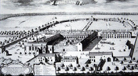 Gravure van Het Roode Klooster in het Zoniënwoud bezuiden Brussel in 1725 door Jean-Pol Grandmont. Bron: Wikimedia Commons. | |