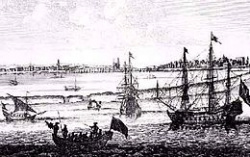 Jan Evertsen (Jan Evertsen Johanszoon) werd begraven in het Braziliaanse Recife, dat destijds onder Nederlands bewind stond en Mauritsstad heette. Tekening: Peter Schenk (1660-1718). Bron: Wikimedia Commons.