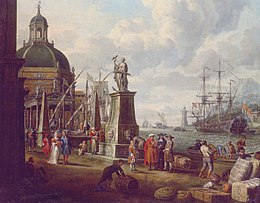 Historische allegorie van Adriaen Verdoel de Jonge van circa 1700, met een mediterraan havenzicht en de Oostkerk van Middelburg, bron: Sotheby's