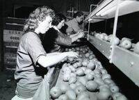 -Vrouwen sorteren fruit op de sorteerlijn voor transport naar de veiling in Goes. Foto: 1962, ZB, Beeldbank Zeeland, recordnr. 21268.