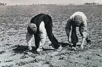 AFBEELDING Landarbeiders; koolzaaddorsen ca. 1910; Brigdamme (W.).