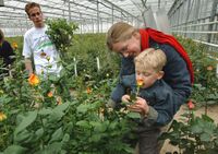 Telen van rozen in kassen in Kapelle. Jongen ruikt aan roos. Foto: J. Wolterbeek, 2004. Bron: ZB/Beeldbank Zeeland, rec.nr. 104248
