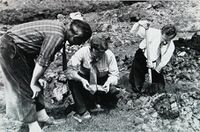 v.l.n.r.: J. van Duyn en Ir. J.A. Trimpe Burger van de Rijksdienst voor Oudheidkundig Bodemonderzoek en Ir. C. Steur van de Stichting Bodemkartering. Bij herverkavelingswerkzaamheden langs de weg tussen Hoedekenskerke en Kwadendamme is men op overblijfselen gestoten die erop wijzen dat daar in de 2e eeuw een Romeinse nederzetting moet hebben gestaan. Foto: PZC, 24-5-1956. Bron: ZB/Beeldbank Zeeland, rec.nr. 25769