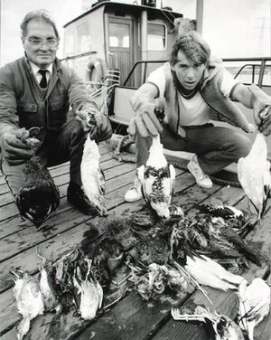 Botulisme; olieslachtoffers opgevist bij de Kreekraksluis. Foto: J. Wolterbeek, ca. 1990. Bron: Wikimedia Commons