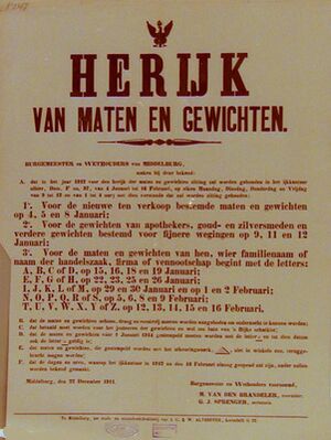 Herijk van maten en gewichten, 1911. Affiche. Bron: ZB/Beeldbank Zeeland, rec.nr. 6198