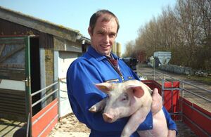 Boer Van Dam te Aagtekerke met varken. Foto: J. Wolterbeek, 2002. Bron: ZB/Beeldbank Zeeland, rec.nr. 103359