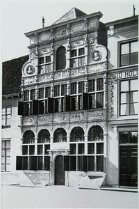 Huize "In de Steenrotse", ofwel "De Steenrots" (verbrand in 1940) in periode (kort voor 1940) toen J.W. Peppelman van Kampen er een antiekhandel in gevestigd had. Eén der oudste particuliere gebouwen, gebouwd in 1590 door meester-steenhouwer Andries de Valckenaere. Zwaar verwaarloosd, dankzij de inspanningen van de Vereniging tot instandhouding van oude gebouwen te Middelburg behouden en rond 1922 als één der belangrijkste bezittingen van Vereniging Hendrick de Keijser gerestaureerd (door Fa. M.K. Jeras en Zoon; restauratiearchitect: A.A. Kok te Amsterdam). Op de gevel: het bewerken van gehouwen steen in het eerste relief, bijbelse taferelen op het tweede relief, borstbeelden van Julius Caesar en Octavianus Augustus, en de zgn. Coronati (beschermheiligen van het steenhouwersgilde). Foto: ca. 1939. Bron: ZB/Beeldbank Zeeland, rec.nr. 7019