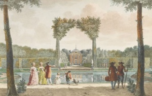 De tuin bij het buiten Popperoeden-Ambacht met op de achtergrond het bijbehorende kanaaltje, aquarel door Jan Arends, ca. 1770-1771, ZA, KZGW, ZI II, 0771k