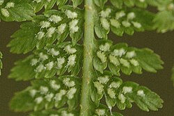 Vruchtbaar blad overdekt met rijpe sporenhoopje bij de wijfjesvaren (Athyrium filix-femina). Bron: Wikimedia Commons
