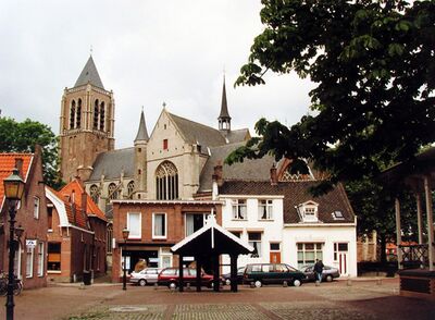 Nederlandse Hervormde Onze Lieve Vrouwe kerk uit de 15e eeuw, gezien vanaf de Markt (Tholen stad). Foto: J. Wolterbeek, 2000. Bron: ZB/Beeldbank Zeeland, rec.nr. 129914