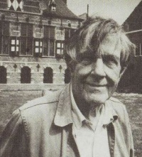 John Cage in 1988 bij de Kloveniersdoelen voor het bijwonen van het Festival Nieuwe Muziek, bron: PZC, 1 juli 1988, pag. 22.