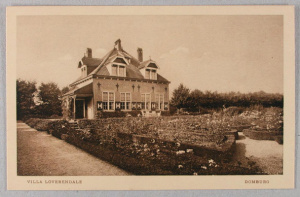 Villa Loverendale, ontworpen in 1906 door Van Nieukerken voor mej Tak van Poortvliet. Prentbriefkaart: A. de Kam, ca. 1920. Bron: ZB, Beeldbank Zeeland, rec.nr. 4451 | |
